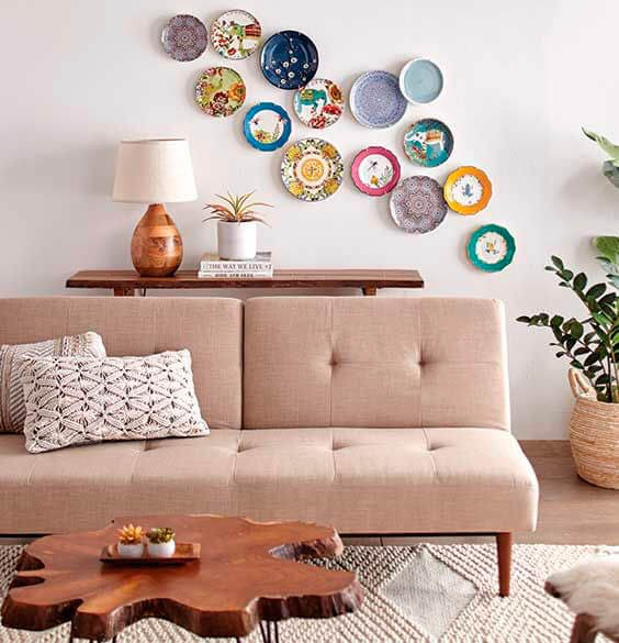 Rekomendasi selanjutnya cukup banyak digunakan dalam menghias atau mendekor rumah yaitu dengan menempelkan piring pada dinding rumah. jika dinding pada rumah Sahabat masih polos dapat Anda gunakan piring-piring cantik yang tidak terpakai. Caranya hanya dengan menempelkan piring ke dinding menggunakan paku ataupun lem, pastikan piring tertempel dengan benar agar tak mudah jatuh. Tata piring dengan pola yang se-estetik mungkin untuk menambahkan kesan art di dalam rumah.